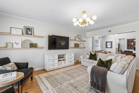 Situated on a quiet, tree-lined street in the desirable Lakewood area of Dallas, this is a beautifully updated 3-bedroom, 2-bath home that blends thoughtful renovations with timeless style. A flexible floorplan and hardwood floors throughout create warm, connected living spaces ideal for both everyday living and entertaining. The kitchen was taken down to the studs and completely rebuilt with custom inset maple cabinetry, a stained maple island, Rejuvenation hardware, marble backsplash, and high-end quartz countertops. An oversized under-mount sink is paired with new appliances including a double wall oven, gas cooktop with Caf vent hood, and built-in microwave. The kitchen opens seamlessly to the dining room, creating an inviting space for gathering, anchored by a fireplace with an updated marble mantle surround. The spacious primary suite offers a peaceful retreat with a walk-in closet and a beautifully updated marble ensuite bath. Two additional bedrooms provide flexibility for fam