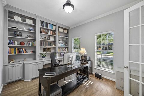 Fabulous home in the sought-after Lakes on Legacy! This well-designed floor plan features both the primary suite and a guest bedroom on the first floor, offering flexibility and convenience. A private office with built-in cabinetry and a spacious closet is also located downstairsperfect for working from home.The newly updated kitchen showcases elegant marble countertops and opens seamlessly to the main living areas, ideal for everyday living and entertaining.Upstairs, youll find two additional bedrooms and a large game room, providing plenty of space for relaxation or play.Energy-efficient upgrades include solar screens, radiant barrier, added fiberglass insulation, and enhanced attic ventilation with additional soffit vents.The backyard offers a storage shed and a unique climbing wall feature on the side of the homeperfect for active lifestyles.Enjoy walking distance to exemplary Tom Hicks Elementary, plus neighborhood amenities including a park, fishing ponds, and a comm