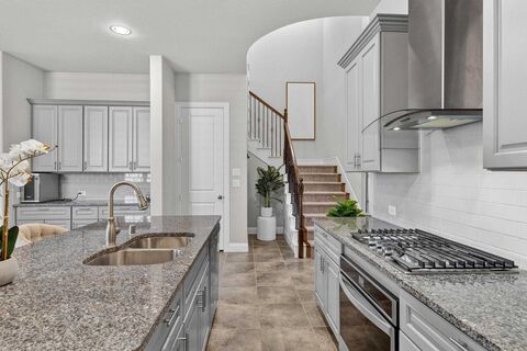 North-facing stately, estate-style home boasts exceptional curb appeal, creating a striking first impression from the moment you arrive. The thoughtfully designed floor plan truly checks every box with the main floor featuring two bedrooms and two full baths, as well as a designated office, a rare and highly desirable layout. The private primary suite is tucked away, creating a peaceful retreat separate from the rest of the home. Real wood and tile flooringno carpet complements the homes high-caliber feel, while 5 inch plantation shutters throughout add a timeless, upscale finish. Head upstairs to find to find two additional bedrooms, an expansive game room, and a large yet cozy theatre-style media roomperfect for entertaining or enjoying family movie nights. At the heart of the home, youll find the chef-style kitchen featuring sleek stainless steel Whirlpool appliances, gas cooktop, dual-bowl stainless steel sinks, granite counters, large center island, coffee bar with tons of ex