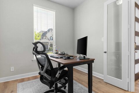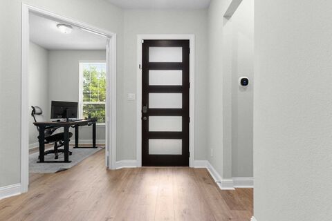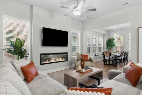 Distinguished designer dream home with impressive curb appeal that checks every box! Thoughtfully designed, the main-floor features the primary suite, a designated office with sophisticated double-pane French glass doors, and a private bath. Upstairs offers an incredible layout perfect for guests or multigenerational living, with four additional bedrooms, including a private mother-in-law suite with its own ensuite bath! A spacious, theater-style game room creates the perfect setting for movie nights or a comfortable retreat for entertaining. The chefs kitchen is a true showpiece, appointed with sleek stainless steel Whirlpool appliances, a 5-burner gas cooktop, built-in microwave and oven combo, striking quartzite countertops, elegant subway tile backsplash, a modern stainless vent hood, an oversized center island, and stunning floor-to-ceiling cabinetry! Enjoy time in your cozy living room with a sleek electric fireplace, an impressive premium upgrade that adds both warmth and moder