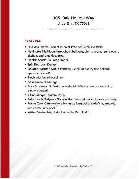 NEW PRICE + 2.75% FHA ASSUMABLE LOAN RARE OPPORTUNIT for lower payments and long-term savings This is the kind of home that just feels right the moment you walk in. Located in the highly desirable Prairie Oaks community in Little Elm, this single-story Perry Home blends comfort, style, and smart living in all the right ways.What truly sets this home apart? Solar panels, a Tesla Powerwall 3, and a Tesla chargergiving you significantly lower electric bills, energy independence, and everyday convenience. Pair that with a rare FHA assumable 2.75% mortgage, and you have a unique chance to secure a lower monthly payment in todays market.Inside, soaring 15-foot ceilings and abundant natural light create an open, welcoming feel. The kitchen is the heart of the home, featuring expansive counter space, abundant cabinetry, and two pantriesperfect for both daily living and entertaining. It flows seamlessly into the living and dining areas, making gatherings effortless.The spacious primary suite