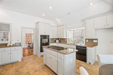Located in the charming and private enclave of The Encore just off Preston Road and minutes from 635, this beautifully updated single-story garden home offers exceptional curb appeal with mature trees, lush landscaping, and a gated front entry that creates a warm and inviting first impression. Inside, the thoughtfully designed floor plan features a spacious kitchen immediately to the left, complete with granite countertops, a large island, butlers pantry with coffee bar, generous walk-in pantry, and a sunny breakfast nook set into a bay window overlooking the front yard. The home has been freshly painted, including the kitchen cabinets, giving it a light and updated feel throughout. The kitchen flows seamlessly into the formal dining room, which opens to an expansive family room highlighted by a cozy fireplace, a wall of built-in cabinetry and shelving, and abundant natural light from numerous windows. A door leads out to the decked patio, creating a perfect indoor-outdoor living spac