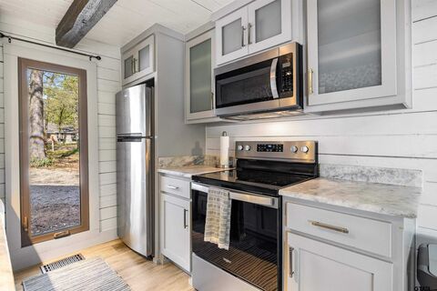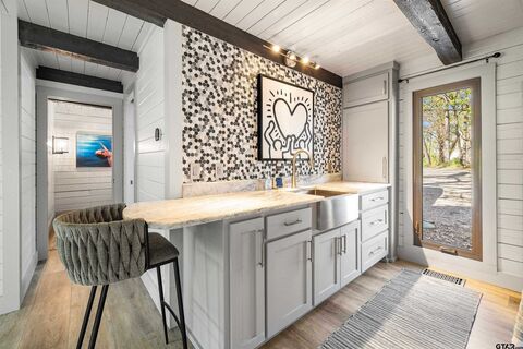 Enjoy lake life the way it's meant to be in this cozy cabin with modern rustic finishes and beautiful water views. Spend your mornings on the covered back porch overlooking the lake and your afternoons on the water with easy access from the concrete cart path to the newly built boathouse with lift and storage. This 1 bed, 1 bath, with an oversized sleeping loft, comes mostly furnished, so pack a bag and start enjoying lake living right away. Interior features include stone kitchen countertops, designer tile, easy-maintenance vinyl flooring perfect for the lake, and a laundry closet with stack washer and dryer. Relax on the newly stained covered back porch, and enjoy the lake breeze and peaceful setting. Located in a calm cove just off the main lake, you get the best of both worlds, protected water with quick access to open water. Low maintenance property with great potential for weekend getaways, full-time living, or VRBO investment opportunity make this one a GEM for sure!