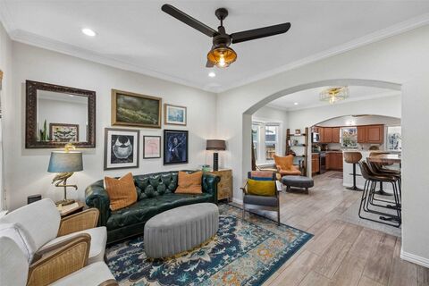 Fully reimagined in 2019, this North Oak Cliff Craftsman blends timeless character with modern charm. From the inviting covered front porch to the open, light-filled interior, every detail feels intentional. Wood-look tile floors anchor expansive living spaces, while the kitchen makes a statement w-granite counters, terra cotta cabinetry, designer SMEG refrigerator, & abundant storageperfect for both daily living & entertaining. Generous laundry room off the kitchen fits full size W&D and a 2nd refrigerator. The thoughtfully redesigned bath offers an elevated feel w-designer tile & classic clawfoot tub. All three bedrooms are generously sized with large closets & great natural light. Step outside to a spacious backyard framed by mature trees, complete with a beautiful wood deck & storage shedideal for relaxing or hosting. Positioned on a quiet curve of a dead-end street, this home offers rare tranquility just moments from Kidd Springs Park, the Aquatic Center, and the energy of Bisho