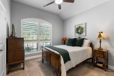 Executive-level living with high-end finishes and many upgrades in this one-story home. The custom front door and beautiful wood flooring lead to two secondary bedrooms and a full bath. Continue down the hallway, past a dining room that can be used as a study or office, accented by French doors. Open concept living area with a stone-accented gas fireplace and an eat-in gourmet kitchen with an updated chandelier. The great room opens to the kitchen, featuring a commercial 6-burner gas range, beautiful venting hood, convection oven, an island breakfast bar, stainless steel appliances, wine storage, and a newly installed farmhouse sink. The primary suite is tucked in the back of the house with separate vanities, a deep garden soaking tub, and a large walk-in closet. Step outside to the backyard with a beautiful covered patio, stamped concrete, a built-in grill, and a Green Egg. Spend time relaxing and unwinding outdoors. Plantation shutters throughout. Laundry with built-in cabinetry. Pri