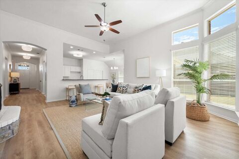 Located in the gated community of Crown Valley near Weatherford Lake, this thoughtfully designed single story home offers both comfort and convenience with easy access to HEB, shopping, and dining. Fresh paint throughout along with all new lighting, appliances, luxury vinyl plank wood look flooring, fixtures. A welcoming entry leads to a dedicated study with glass French doors, providing an ideal space for working from home or a quiet retreat. Two additional bedrooms are well-sized and share a hall bathroom, providing comfort and flexibility for family or guests. The private primary suite offers a spacious walk-in closet and an ensuite bath complete with a spa tub, separate shower, dual sinks, and generous storage. The primary bath has been updated with new toilet, shower, countertops, lighting, and all fixtures.At the heart of the home, the kitchen is equipped with a pantry, center island, and breakfast bar, seamlessly opening to the dining and living areas. The inviting li