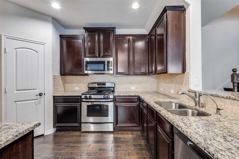 This end-unit townhome in sought-after Hemingway at Craig Ranch, within highly acclaimed Frisco ISD, is a rare find. Ideally located just a short stroll from the community clubhouse, resort-style pool, and fitness center, this home offers both convenience and lifestyle. The thoughtfully designed floor plan features a private primary suite on the first floor, while two secondary bedrooms and full bath are located upstairs, along with a massive game room, media room or second living area with vaulted ceilings.The bright and inviting interior showcases an open floor plan with fresh paint and carpet installed in March 2026. The kitchen is perfect for entertaining and includes granite countertops, stainless steel appliances, and gas cooking, seamlessly flowing into the main living and dining areas. A formal dining space on the first floor adds flexibility for hosting gatherings.The spacious primary suite is filled with natural light and offers a well-appointed en-suite bath with dua