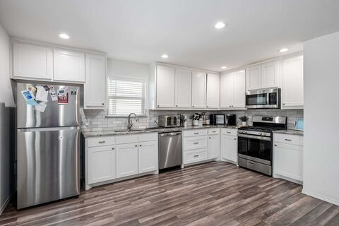 Well updated single-story home in an established Denton neighborhood with mature trees and no HOA. This 3 bedroom, 2 bath home offers two living areas, giving flexibility for a second lounge, office, or playroom. The main living space features a fireplace and great natural light, while the updated kitchen includes granite countertops, white cabinetry, stainless steel appliances, and modern finishes throughout.Recent improvements include updated flooring, windows, fixtures, and interior paint, making the home move-in ready. Both bathrooms have been refreshed with clean, modern styling.The backyard offers a functional outdoor space with room to entertain, plus a hot tub installed in 2025, adding a great spot to relax year-round. Located within walking distance to Ginnings Elementary and Strickland Middle School, with convenient access to Loop 288 and nearby shopping and dining.A solid option for buyers looking for updated condition, flexible living space, and a central Denton