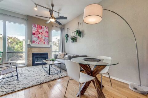 Nestled in the vibrant heart of Oak Lawn, this sophisticated two-story condo offers a premier urban lifestyle just moments from Dallas most celebrated high-end dining and retail. Step inside to find a light-filled, open-concept sanctuary where modern elegance meets everyday functionality. The main level boasts rich hardwood floors and a seamless flow from the inviting living area, anchored by a sleek electric fireplace, into a chef-inspired kitchen. Featuring crisp white shaker cabinetry, premium quartz countertops, a kitchen bar, and stainless-steel appliances, this space is as perfect for hosting soires as it is for quiet morning coffees. Ascend to the second level to discover the expansive primary suite, a versatile haven with ample room for a dedicated home office or a private sitting area. Organization is effortless thanks to two generous custom closets, while stylish laminate flooring adds a contemporary touch. Smart home features, including a Ring doorbell and Nest thermostats