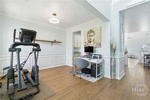 Located in the desirable Gates at Savannah Quarters, this meticulously maintained 4BR/2.5BA home offers upgrades, style, and space. The bright, modern interior features luxury flooring throughout the entire home. (no carpet) The open-concept floor plan, separate dining room/office and upgraded appliances are perfect for entertaining and everyday living. The main-level owners suite offers a beautifully updated bathroom with tile flooring and a walk-in closet with custom built-ins. Upstairs youll find three spacious bedrooms, a full bath, and a versatile loft with built-in shelving and cozy reading nook. (& walk-in attic) Step outside to an oversized covered patio and a large, fully fenced backyard offering privacy, lagoon views and plenty of space to enjoy the outdoors. With thoughtful upgrades, designer touches, and exceptional maintenance, this home is move-in ready with the look and feel of a custom new build! Located conveniently to everything Savannah has to offer!