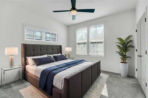 Experience elevated intown living at 900 Brees Ct - a distinctive, like new end-unit townhome near Atlantas vibrant and rapidly growing West Midtown and Upper Westside districts. Designed with a unique and functional floor plan with true penthouse-style appeal and skyline views of Midtown Atlanta with benefits of added privacy as an end unit. The upper-level living space offers an airy, open-concept layout with soaring vaulted ceilings and hardwood floors seamlessly connects the kitchen, dining, and living areas perfect for entertaining or enjoying everyday living above the city. The kitchen features a large island, ample cabinet storage, quartz countertops, and stainless steel appliances. Large windows bring in abundant natural light while framing impressive urban views. Step outside onto the private oversized deck, an extension of the living space for relaxing mornings with coffee, outdoor dining, or enjoying Atlantas skyline sunsets. On the main level, the 2 bedroom, 2 full bat