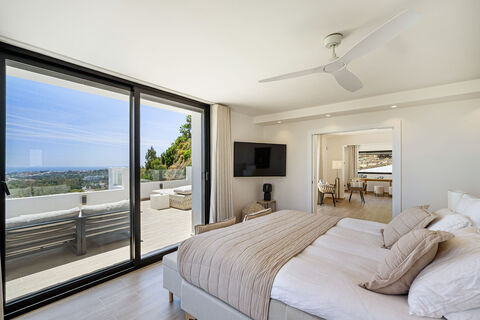 Stunning residence in the prestigious enclave of Las Lomas de Nueva Andalucia blends elegant indoor living with expansive outdoor enjoyment across three sophisticated levels. The architectural design is defined by soft neutral tones, high-end materials, and a renovation that maximizes natural light through a south-facing orientation. At the heart of the home, an open-plan living area connects seamlessly to a sleek modern kitchen and formal dining space, all of which lead out to large terraces designed for entertaining. The primary sleeping quarters occupy the top floor to ensure ultimate privacy, featuring a spacious walk-in wardrobe and serene vistas stretching to the Mediterranean Sea. For guests or professional needs, the villa offers a total of five bedrooms, one of which is currently utilized as a home office. The lower level provides a dedicated entertainment space with a cozy lounge area ideal for a media or TV room. Outdoor living is defined by meticulous landscaping and a stunning infinity pool that visually merges with the horizon. While the property does not include a traditional garage, the gated area comfortably accommodates up to four cars, with additional space for three more vehicles at the upper entrance. Residents benefit from an unbeatable orientation that provides some of the most breathtaking sea views in the entire Nueva Andalucia area. The lifestyle afforded by this location is defined by its proximity to Marbella's most elite amenities, including world-class golf courses like Los Naranjos and Aloha Golf Club, as well as the luxury boutiques and fine dining of Puerto Banus. This setting offers a unique balance of a secluded residential atmosphere with immediate access to the vibrant social hubs and international schools that characterize the prestigious Golf Valley.