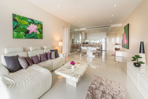 This 2-bedroom condo for sale near Surin Beach in Phuket is also within a similar distance to Bang Tao Beach. The unit offers foreign freehold ownership and comes fully furnished. The interior is modern and well appointed, with sleek white finishes and furnishings, complemented by large glass panels and a full wall of mirrored panels beside the dining area, enhancing light and creating a greater sense of space. Subtle purple accents, seen in soft furnishings and decor, add a touch of elegance and character.