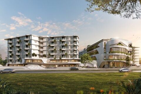 A large-scale, resort-style development defined by open design, landscaped green spaces, coral tones, and a walkable seaside location with easy access to the beach and everyday amenities.