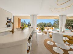 Outdoor living is central to the experience of this property. Several terraces provide different areas for dining, lounging and entertaining. A covered dining space and outdoor kitchen with barbecue make it easy to host gatherings while enjoying Ibiza's warm evenings. The rooftop terrace is a standout feature, offering beautiful panoramic sea views. Here you will find a round sunbed, comfortable seating and a fire pit that creates a special atmosphere after sunset, making it the perfect place to relax under the stars.