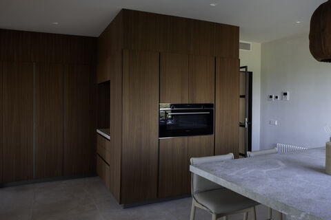 Upstairs: three bedrooms with stunning views. Two feature oak parquet flooring, built-in wardrobes, and en-suite bathrooms with Mallorcan stone sinks. The master suite offers a walk-in dressing room with vanity, oak floors (microcement shower), and a private bathroom.