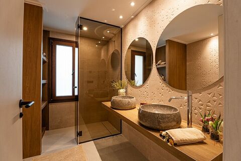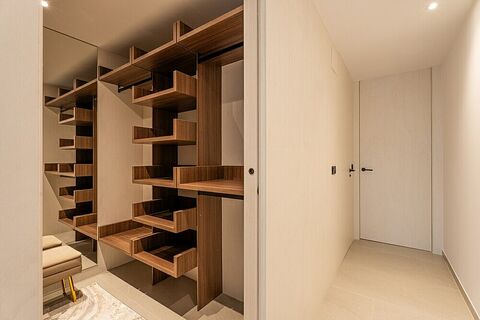 Distributed on a single floor, these magnificent villas have 3 bedrooms with fitted closets and dressing room in the master bedroom. Its two bathrooms, one of them en suite, are fully equipped with sink, mirror, full shower screen and underfloor heating. Open plan lounge with fitted kitchen and breakfast bar with patio doors leading to a large private terrace with pergola area, overlooking the private swimming pool.