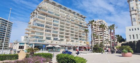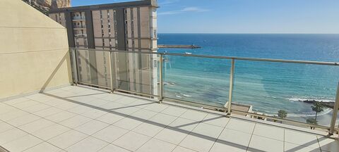 Exceptional offer of this prestigious 1st line apartment which was originally designated as a 3 bedroom floor plan but modified at the time of construction into 2 bedrooms to make the lounge/dining area much larger and a more comfortable living area, this can easily be modified and returned back into a third bedroom if required. The location of this building offers breath-taking south facing views from its 10th floor location towards Benidorm and also down to Calpe port area with incomparable sunsets. The lounge leads onto a large half glassed terrace with fitted roller sunblind's overlooking the private clubhouse, pool, showers, changing rooms and gardens with private access down to the beach, fishing port and marina. The main entrance door leads through into the hallway where there are 2 complete shower rooms, separate kitchen with utility terrace again with good views over the salt lakes. The complex has 24 hr security and very secure with an allocated private underground parking space included, paddle court and children's play ground within the complex. Being sold fully furnished and equipped with central a/c - heating system. VIEWING ESSENTIAL.