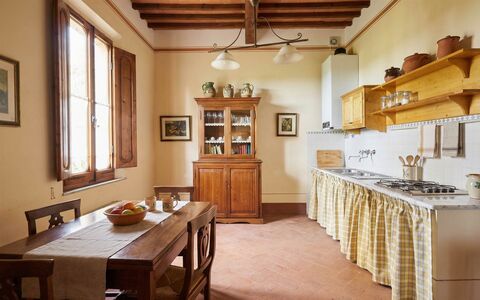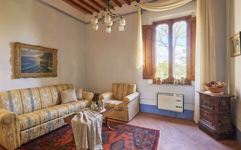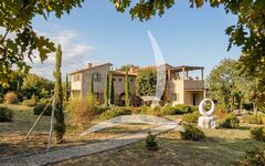 in a panoramic position just minutes from the historic center of Montepulciano, we offer for sale a magnificent period villa with early 19th-century foundations, distinguished by a refined Art Nouveau (Liberty) style. The property, totaling approximately 935 sqm, perfectly preserves its original charm: solid wood doors, hand-made stained glass windows, and floors decorated with original geometric patterns. The entrance is graced by a dramatic travertine staircase that floods the interiors with light. The villa is currently organized into four independent yet harmoniously connected units: the ground floor houses three bedrooms with private bathrooms, while the first floor features five bedrooms. An independent annex with a living room, kitchen, bedroom, and bathroom completes the residence, ideal for guests or staff.