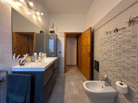 in the quiet countryside on the outskirts of Cecina, we offer for sale an independent portion of a farmhouse of approximately 203 sqm, characterized by a warm and welcoming atmosphere. The main residence is located on the first floor: the entrance opens onto a spacious living area where a modern, functional kitchen blends with a bright lounge, enhanced by a stone fireplace and a soft ochre sofa. The kitchen provides access to a charming small balcony overlooking the garden. The sleeping area includes two large double bedrooms, a bathroom, and a third room currently used as a study. On the ground floor, the property features a laundry room and a warehouse that can easily be converted into a small independent apartment, as well as an additional 60 sqm warehouse space ideal as a tavern or workshop. All ground-floor rooms have the potential for conversion into residential use.
