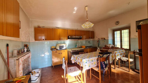 It is composed on the ground floor of an entrance, a long corridor that connects different rooms including the living room with open kitchen and fireplace, cellar with fireplace, closet and garages with internal access.