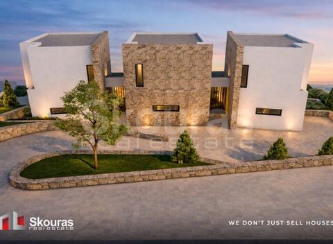The villa is arranged across multiple levels, including ground and first floor with additional basement space, offering a functional layout designed to maximize both indoor comfort and outdoor living. The architectural concept follows a modern Mediterranean style, incorporating natural materials such as stone finishes, earthy tones, and elements that blend harmoniously with the surrounding landscape.