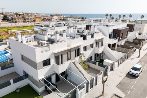 Upstairs, the real highlight of the home awaits - a fantastic, sunny roof terrace with generous surfaces. Here you will find an outdoor kitchen, pergola and outdoor shower, as well as plenty of space for both lounge furniture and a dining set. This is the perfect place for relaxation, social events and to enjoy the Spanish climate all year round.