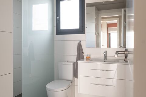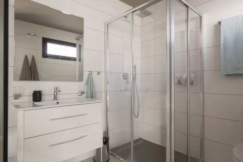 All bedrooms are located on the same floor, creating a comfortable and practical living space. The master bedroom offers an elegant en-suite bathroom with shower, while the two other bedrooms both have double beds and built-in wardrobes, with the home's clean and harmonious design throughout. In addition, there is an additional modern bathroom with shower, both bathrooms equipped with underfloor heating.