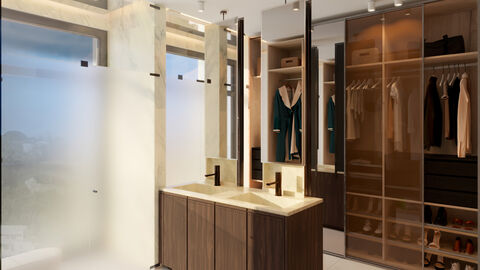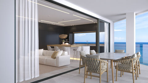A private keyed elevator opens directly into the residence, offering a discreet and elevated sense of arrival. The open-plan living and dining spaces are defined by clean architectural lines and generous proportions, creating an environment that feels equally suited to relaxed daily living and understated entertaining. Finishes are contemporary yet restrained, allowing the sea to remain the natural focal point.