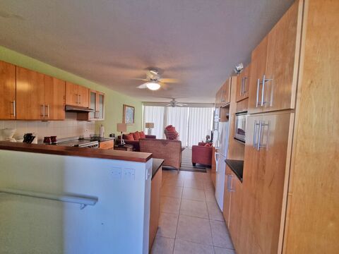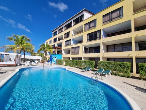 The modern kitchen is fitted with quality appliances including a stove, oven, refrigerator, and dishwasher, with a washer and dryer also included for convenience. Additional benefits include elevator access, a dedicated parking space, and a private storage locker. The development offers a large communal swimming pool, direct beach access, and a rare private jetty, ideal for sunbathing or simply enjoying the calm of the Caribbean Sea.