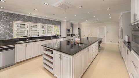 The primary suite is a private sanctuary, complete with a secluded balcony overlooking the fairway, generous dressing areas, and a beautifully appointed spa-style bathroom. Four additional guest suites provide comfort and privacy, each thoughtfully designed to capture light, garden views, and a sense of calm.