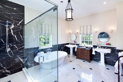The residence features five spacious bedroom suites, each thoughtfully designed for comfort and privacy. Air-conditioned bedrooms include ceiling fans, walk-in closets, cable television, safes, and beautifully finished marble en-suite bathrooms with rain showers. The impressive primary suite serves as a private retreat, complete with a luxurious soaking tub and serene garden views.
