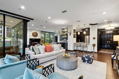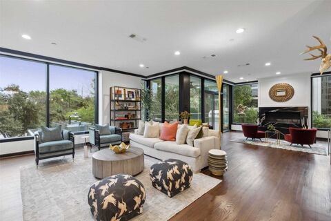 Tucked into the northeast corner of The Claridge, this fully renovated residence feels like a private retreat in the treesoverlooking the Katy Trail with serene, uninterrupted greenery from every window.Spanning 2,020 square feet, the home was completely reimagined in 2020 with a focus on elevated design and effortless living. Light-filled interiors feature soaring 95 ceilings, warm hardwood floors, and a stunning custom fireplace framed in Cambria quartz.Designed for both everyday living and entertaining, the open living space is complemented by a one-of-a-kind Palmer Industries brass and glass floating bar with a dramatic python tile backdrop. The kitchen is equally impressive, featuring a Bertazzoni appliance suite, quartzite countertops, and a seamless full-height backsplash.Every detail has been thoughtfully curatedfrom the marble bathrooms and custom black-paneled primary shower to the striking powder bath with lucite and brass finishes. A private balcony with Pre