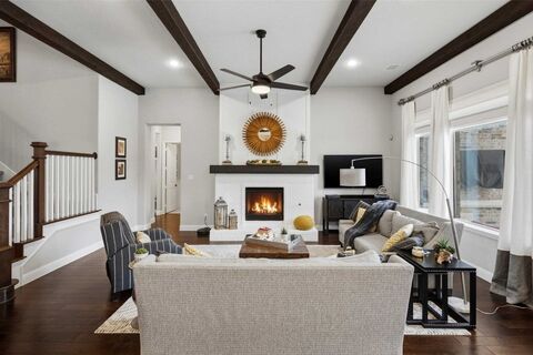 This custom-built home is a true standout, offering timeless elegance, luxury and functionality and lots of extras. Inviting entry with rich hardwood floors, detailed millwork, and designer lighting sets the tone for this beautifully appointed home. Exceptional outdoor living with a resort-style pool and expansive patio that offers multiple seating areas. Covered outdoor living with vaulted wood beam ceiling, built-in grill station, perfectly designed for year-round entertainment with convenient pool bath providing easy access for guests. A private study with French doors and custom wall detailing offers a quiet workspace and has F5 storm shelter in the closet. Formal dining room provides an elegant setting for gatherings. The open-concept living area features soaring ceilings with exposed wood beams, abundant natural light, and a beautiful fireplace. Seamlessly connected, the chefs kitchen is equipped with an oversized island with quartzite countertops, stainless steel appliances, ga