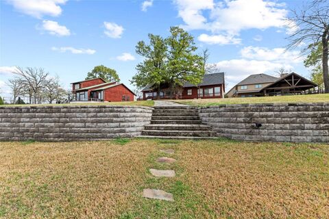 Tucked inside a sought-after gated community, this waterfront retreat sits on just over half an acre with mature trees, elevated open water views, and a rare combination of open water views and protected cove frontage.Inside, the home is designed for gatheringfeaturing vaulted ceilings, a stunning stone fireplace, and an open-concept layout that flows seamlessly from the living area to a beautifully updated kitchen. A large island is complemented by updated countertops, backsplash, fixtures, stainless steel appliances, and a double oven. Hickory engineered hardwood flooring adds warmth and character throughout the main living areas.The main level offers three bedrooms, including a peaceful waterside primary suite with a walk-in shower and generous closet space. Upstairs, a game room and bunk room create the perfect setup for hosting family and friends at the lake.Step outside and enjoy everything lake life is meant to bewhether you're relaxing on the spacious deck, entert