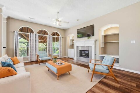 Nestled on a beautiful, treed creek lot in Highland Shores, this inviting home offers space, comfort, and wonderful outdoor living. The entry opens to a formal dining and a private study, creating an ideal layout for both entertaining and working from home. The home flows into a well-appointed kitchen featuring granite countertops and wonderful views of the backyard. The spacious family room showcases a cozy fireplace, custom built-ins, and walls of windows that bring in abundant natural light inside the home. Wood flooring and bright, open living spaces add warmth to the main areas. The private primary suite is conveniently located on the first floor, offering a quiet retreat. Upstairs, youll find 3 additional bedrooms, a large gameroom, and a versatile bonus room. Enjoy the backyard oasis, complete with a large patio featuring a built-in grill and refrigerator, perfect for entertaining. The pool and spa overlook the peaceful creek and mature trees, creating a relaxing and scenic set