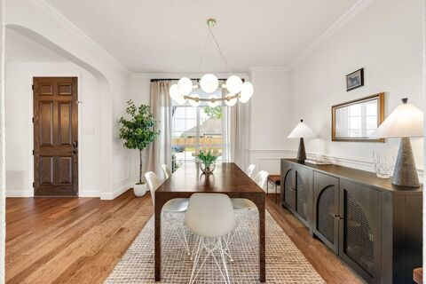 Tucked at the end of a quiet cul-de-sac near the lake, this home offers privacy, space, and a setting that feels both peaceful and inviting. Surrounded by well-maintained landscaping, it makes a strong first impression from the moment you arrive. Step through the front door into a home that feels refined and thoughtfully designed, where clean finishes and natural light set the tone. Fresh Benjamin Moore paint and stylish updated lighting run throughout, giving the home a cohesive, move-in ready feel. Just off the entry, the formal dining room features picture frame molding and a statement chandelier, creating a warm and elevated space for hosting. The main living area opens with a wall of windows overlooking the backyard, filling the space with natural light. A fireplace anchors the room, making it ideal for both everyday living and gathering with friends and family.The kitchen is both functional and refined, with granite countertops, shaker-style cabinetry, and a newly installed Ita