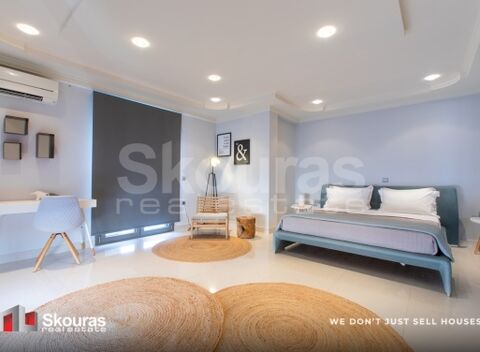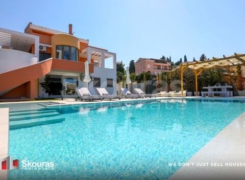 In one of the most privileged locations in northeastern Corfu, an iconic 497 sq.m. villa is for sale, combining absolute privacy with unparalleled views of the Ionian Sea. The property extends over a 1,073.59 sq.m. plot and is a unique example of contemporary architecture and functional luxury. The villa is situated on a hill in the settlement of Alykes - Potamou, with direct access to the island's top beaches, such as Kommeno, Kassiopi, Gouvia, Barbati, and Paleokastritsa. Its location ensures less than 4 km from Corfu town, the port, and the 'Ioannis Kapodistrias' International Airport. The residence has been designed with autonomy and comfort in mind, making it ideal for both private residence and investment exploitation under EOT operation. On the ground floor, there are two independent apartments: Apartment A includes a master bedroom with en-suite bathroom and walk-in closet, a second spacious bedroom, a large bathroom with double sink, an open-plan living-dining area, fully equipped kitchen, and direct access to the garden. Apartment B consists of one bedroom and an additional guest space with direct access to the pool area. The main maisonette extends over the first and second floors. On the first level, there is an impressive living room with dining area, a high-spec kitchen, and two bedrooms. The internal staircase leads to the second floor, where the master bedroom with en-suite Jacuzzi and two additional bright bedrooms are located. All rooms have their own semi-outdoor spaces with unobstructed views of the Corfu landscape. The villa is fully equipped with state-of-the-art systems. It features heat-pump heating/cooling, air conditioning in all spaces, an energy-efficient fireplace, solar collectors for hot water production, advanced security and fire protection systems, as well as high-speed Wi-Fi and full premium household equipment. The surrounding area is a private paradise, with a private pool and perimeter sunbathing area, covered pergola with dining and lounge area, fully equipped BBQ, elegant garden with lawn and ornamental plants, as well as private parking spaces within the plot. This is a rare investment opportunity combining high construction quality with a strategic location in one of the most popular tourist destinations worldwide.