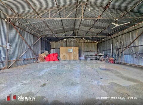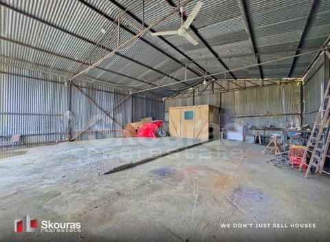 It is a metal structure with sheet metal (tin) roofing, suitable for professional use. It features single-phase electricity supply, a height of 5 meters, as well as a spacious entrance door allowing easy access and entry for large vehicles.