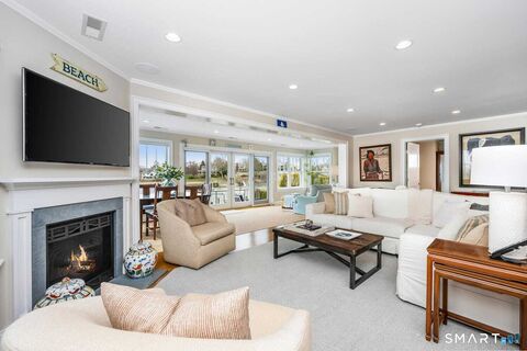 Set along the picturesque Five Mile River with its own private beach and dock, this exceptional waterfront home captures sweeping views of the Long Island Sound and unforgettable sunsets from multiple outdoor living spaces, including a terrace with a gas fireplace and two expansive decks. Located in the heart of the sought-after Rowayton Beach Association, the residence offers a bright, open floor plan with water views from nearly every room. Featuring four bedrooms and two-and-a-half baths, including a convenient first-floor primary suite, the home is in wonderful condition and FEMA compliant. Ideal for those looking to downsize without compromise, with the flexibility to expand for a larger lifestyle-all just a short walk to downtown Rowayton and its charming amenities.