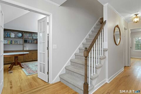 Exceptional upgraded townhome in one of Ridgefield, CT's most coveted village center communities - enjoy the benefits of turn-key living without sacrificing space or style. Optimally sited in the heart of Quail Ridge, residence #27 offers a rare 2,450 sf. of elegant and functional living space spanning across four fully-finished levels. Upon entry at grade, guests are greeted by a sophisticated main floor drenched with natural light; gleaming hardwood floors flowing into a generously-sized living room with cozy fireplace; dining room with ample space for entertainment; kitchen with new appliances; den with built-ins and half bath. Above, a serene primary bedroom suite with renovated en suite full bath; tastefully appointed hallway full bath and second bedroom with easy access. On the 3rd floor, a flexible family room or 3rd bedroom option with ample closet space. On the lower level, an additional recreation area; ideal office or gym with walkout to private patio overlooking the tranqui