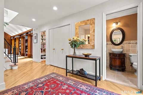 Come home to this exceptional contemporary residence in the estate area of Woodbridge, set on 1.53 beautifully landscaped acres offering privacy and neighborhood charm, highlighted by a stone wall and a large, open backyard with a new fence installed in 2024. The 2025 remodeled gourmet kitchen features KraftMaid cabinetry, premium Cambria quartz countertops, and Thermador appliances, including a French door refrigerator, double oven and beverage drawers in the coffee bar. A sun-filled breakfast room with vaulted ceilings, skylights, and sliders opens to the expansive deck. The great room showcases cathedral wood-beamed ceilings, built-ins, and a raised hearth slate fireplace, while the formal dining room also offers built-ins and deck access. The first-floor primary suite includes vaulted beamed ceilings, four double closets, and a bath with tub, separate shower, and double vanity. A bedroom, office with built-ins, laundry, mudroom, and half bath complete the main level. Upstairs, two