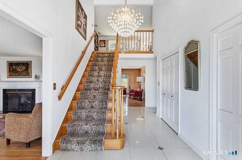 Timeless charm greets you upon your arrival at this graceful Cape Cod-style home, with elements of Colonial architecture, that has 5 bedrooms, 3 full bathrooms, 2 half bathrooms, and approximately 3454 sq ft of finished living space. Located on a cul de sac, the home is conveniently located in Central Woodbridge and is majestically sited on 1.66 acres. At the front entry, you'll note the home's elegance and spacious layout. There is a living room to sit comfortably with guests and share the enjoyment of a gas fireplace. There is a adjoining dining room for more formal entertaining which leads to a spacious updated kitchen that has granite counters, lots of cabinet space, 2 pantry closets, a large center island (w/seating), an eat-in area and newer stainless steel appliances. One side of the kitchen leads to a mud room area (with washer & dryer & half bathroom), that enters into the attached 2 car garage. The other side of the kitchen leads to a stunning family room w/ a wood burning fi