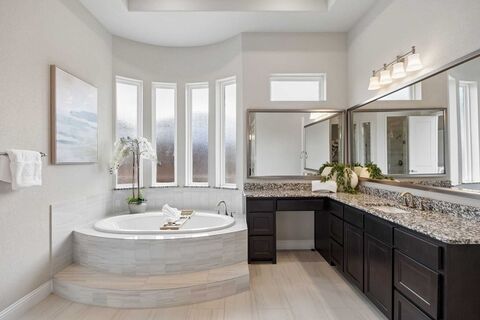 Experience elevated living in a guarded, gated Frisco community. This thoughtfully designed 2 story residence offering 5 ensuite bedrooms, dual primary suites on lower level and over 5,300 square feet of refined space where every room feels intentional, every detail adds comfort, and every corner invites you to imagine the way you want to live. Completed in 2022 and situated on a north-facing spacious lot, this home blends sophisticated design with functional flexibility for modern lifestyles. A grand entry introduces a private home office and an elegant staircase, opening to a light filled living area with soaring ceilings and a striking floor-to-ceiling stone fireplace. Oversized windows enhance the open concept layout, creating a seamless flow for both daily living and entertaining. The kitchen is designed for gatherings, featuring a butlers pantry, wet and dry bar, and direct connection to the formal dining space. Designer finishes, custom cabinetry, and carefully selected lig
