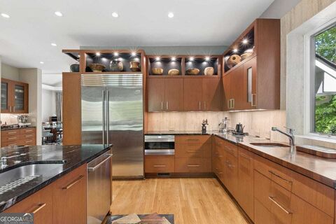 The Bentwater Estate is tucked away like a private retreat in the forest along the Chattahoochee River, this one-of-a-kind, architect-designed home offers a rare blend of natural serenity and refined living. Located in the exclusive Bentwater enclave at the back of Grogans Bluff-home to just 16 estate properties-this contemporary hard coat stucco residence sits on 1.5 acres, creating a peaceful, secluded setting that feels worlds away from the city. Surrounded by mature trees and the soothing presence of nature, the home is designed for both effortless entertaining and quiet relaxation. The open floor plan flows beautifully while still offering distinct, purposeful spaces. A dramatic two-story foyer welcomes you in, leading to the central living room, which is framed by an elegant dining room that seats 12+, a game room with a pool table, and a warm, inviting den. The kitchen is a true showpiece, outfitted with Sub-Zero and Wolf appliances, including double ovens and a warming drawer.