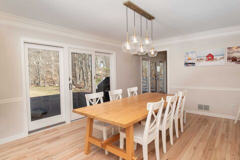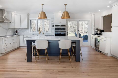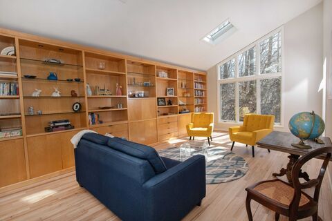 Welcome Home! Privately set at the end of a cul-de-sac on 1.10 level acres, this light-filled Contemporary offers the perfect blend of space, style, and tranquility just minutes to town. A true showpiece, the fully renovated kitchen and mudroom feature abundant custom cabinetry, stainless steel appliances, quartzite countertops, and an oversized center island, all bathed in natural light and designed for both everyday living and entertaining. Soaring ceilings and walls of windows create an airy, open feel throughout the main level, complemented by newly refinished hardwood floors. Sliders lead to a spacious Trex deck overlooking the expansive, level backyard--rare for the area and ideal for play, gatherings, or simply enjoying the surrounding privacy. The family room with fireplace, formal living and dining areas, and updated powder room complete the main level. Upstairs, the primary suite offers vaulted ceilings, walk-in closet, and full bath, along with three additional bedrooms, hal