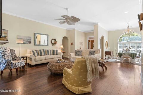 Welcome to 1872 Oak Harbour Dr SW in beautiful Ocean Isle Beach, NC, located in the highly desirable community of Oak Harbour. This charming home offers the rare opportunity to own a true coastal retreat in a small, established neighborhood filled with mature trees and lush landscaping--an oasis you simply won't find in today's new construction communities. FORTIFIED Roof installed in 2022. Step into the welcoming foyer and take in the open-concept living and dining areas, highlighted by 10' ceilings, crown molding, abundant natural light, plantation shutter, wood grain laminate flooring, a gas fireplace, and a ceiling fan. Large windows frame peaceful views of the backyard.The kitchen features Silestone countertops, a bar-height counter for stools, electric double-oven range, built-in microwave, dishwasher, and a cozy breakfast nook with a bay window. Double doors lead from the kitchen to the spacious covered porch, perfect for indoor-outdoor living.A split floor plan ensures priv