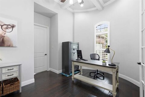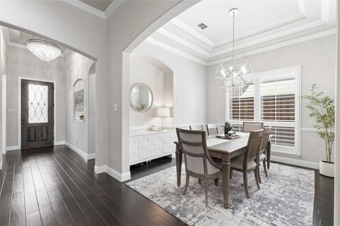 NO MUD NO PID!!!!! Discover this unique and versatile floor plan featuring three bedrooms downstairs and a private upstairs retreat with a fourth bedroom, oversized game room and dedicated media roomideal for multi-generational living, guests, or extended family stays. Thoughtfully designed for both comfort and function, the home offers flexible spaces that easily adapt to your lifestyle.At the heart of the home is a chef-inspired kitchen, beautifully appointed with a gas cooktop, large island with breakfast bar seating and a walk-in pantry, seamlessly connecting to the main living areas. Natural light fills the interior, highlighting the rich wood flooring, modern lighting and elegant plantation shutters throughout.A front-facing study offers a refined workspace with a decorative ceiling treatment and additional storage, making working from home both practical and convenient. The primary suite is a true retreat, featuring a sophisticated coffered ceiling and a spacious ensuite ba