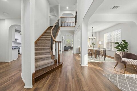 Welcome to this beautifully updated home that perfectly blends timeless architecture with modern comfort. Nestled on a tree-lined street, the striking brick faade, arched windows, & mature landscaping create an inviting first impression w-undeniable curb appeal. Step inside to soaring ceilings & a grand entryway anchored by a dramatic curved staircase w-wrought-iron balusters. Rich flooring flows seamlessly throughout the main living areas, complemented by elegant arched openings & an abundance of natural light that fills the home. The thoughtfully designed layout offers both functionality & style, featuring stacked formals. The spacious main living rm showcases a stunning two-story ceiling, expansive windows, & a cozy fireplace, creating the perfect setting for everyday living and gatherings. The kitchen is open & well-appointed w-generous counter space, ample cabinetry, & a breakfast bar that connects effortlessly to the living areaperfect for hosting or casual dining. An elegant P