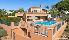 This 514 m2 detached villa, set on a 2500 m2 plot, features an entrance hall, a cloakroom, a spacious open plan living room with fireplace, a dining room, and a beautifully appointed kitchen with island, breakfast counter, and premium appliances from BORA, AEG, and Liebherr, a laundry room, and four bedrooms all ensuite. Outside, there is a covered terrace with an Al Fresco dining space, a large heated saltwater swimming pool, terraces, an outdoor cooking station, gardens featuring fruit trees, a private driveway, and a single garage. Layout Entrance hall and cloakroom Open-plan living and dining room with covered terrace Modern fitted kitchen with island, laundry room Four double bedrooms and four bathrooms Outside Private heated saltwater swimming pool Sun terraces and a covered dining area BBQ, outdoor cooking station Single-car garage, ample parking Fully fenced 2,500 m2 plot for privacy Location Located within a short distance from Almancil town's center and within easy reach of Quinta do Lago and Vale do Lobo. At a glance Two-storey 514 m2 build, 2,500 m2 plot Built in 2025 Four bedrooms, four bathrooms, cloakroom Pool, terraces, covered dining, BBQ, cooking station Single garage, parking Gardens